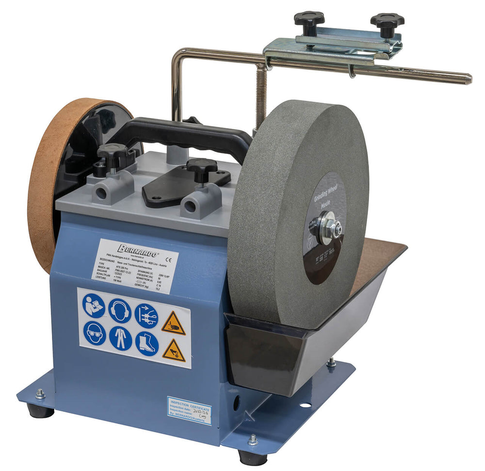 La Bernardo NTS 250 Pro è un’affilatrice a secco-umido di livello professionale, progettata per garantire affilature precise, rapide e sicure. Grazie alla mola in corindone bianco da 250 mm che lavora in vasca ad acqua (rimovibile), l’utensile viene raffreddato durante la lavorazione, prevenendo il surriscaldamento e il rischio di rinvenimento. La velocità ridotta di 95 giri/min riduce al minimo le scintille e aumenta la sicurezza operativa. È dotata di supporto universale regolabile in altezza, compatibile con accessori di vari produttori, e di ruota in pelle da 200 mm per la lucidatura finale. Con un potente motore da 150 W e struttura robusta in lamiera d’acciaio, la NTS 250 Pro è ideale per coltelli, forbici, asce, scalpelli, lame di pialle e utensili da tornitura. Perfetta per hobbisti evoluti, artigiani e professionisti che necessitano di lame sempre affilate con la massima precisione.