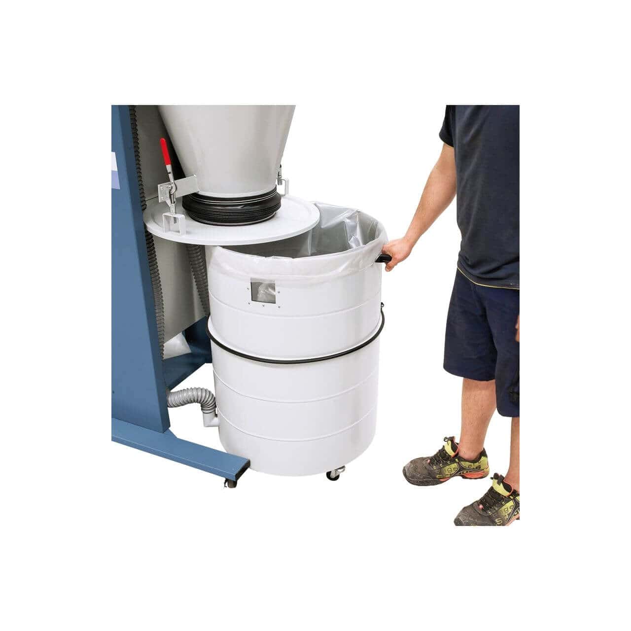 L’aspiratore ciclonico Bernardo RLA 2700 è una macchina professionale ad alte prestazioni, ideale per officine e falegnamerie di piccole e medie dimensioni. Grazie al sistema ciclonico mobile con capacità d’aspirazione fino a 2700 m³/h e depressione massima di 2800 Pa, garantisce un flusso costante e un’elevata efficienza di separazione delle polveri. Il filtro a cartuccia in poliestere autopulente (residuo di polveri 0,1 mg/m³) assicura un’aria pulita e un’aspirazione costante, mentre il manometro integrato permette di monitorare facilmente il volume minimo d’aria. Il contenitore estensibile da 138 litri e il sacco da 190 litri assicurano lunghi cicli di lavoro, con svuotamento rapido e pratico. La macchina è inoltre dotata di telecomando, timer regolabile e carrello mobile, per un utilizzo semplice e sicuro.