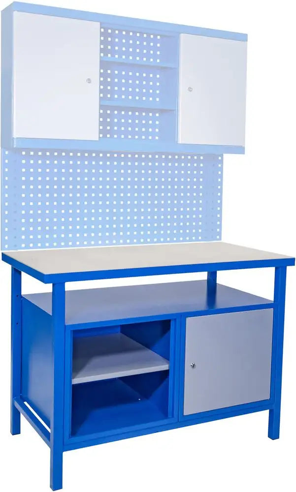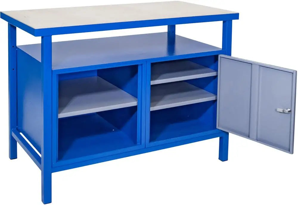 Il piano da 38 mm, con impiallacciatura in faggio su entrambi i lati e base in pannello ad alta densità, garantisce resistenza all’usura quotidiana. Questo modello integra un vano aperto con ripiano removibile e un vano chiuso con anta rinforzata, dotata di serratura a cilindro con 2 chiavi, per custodire utensili e materiali in sicurezza. La finitura a polvere blu RAL 5015 per la struttura e grigio RAL 7001 per ante e cassetti dona un aspetto professionale e ordinato. Un banco affidabile firmato Güde.