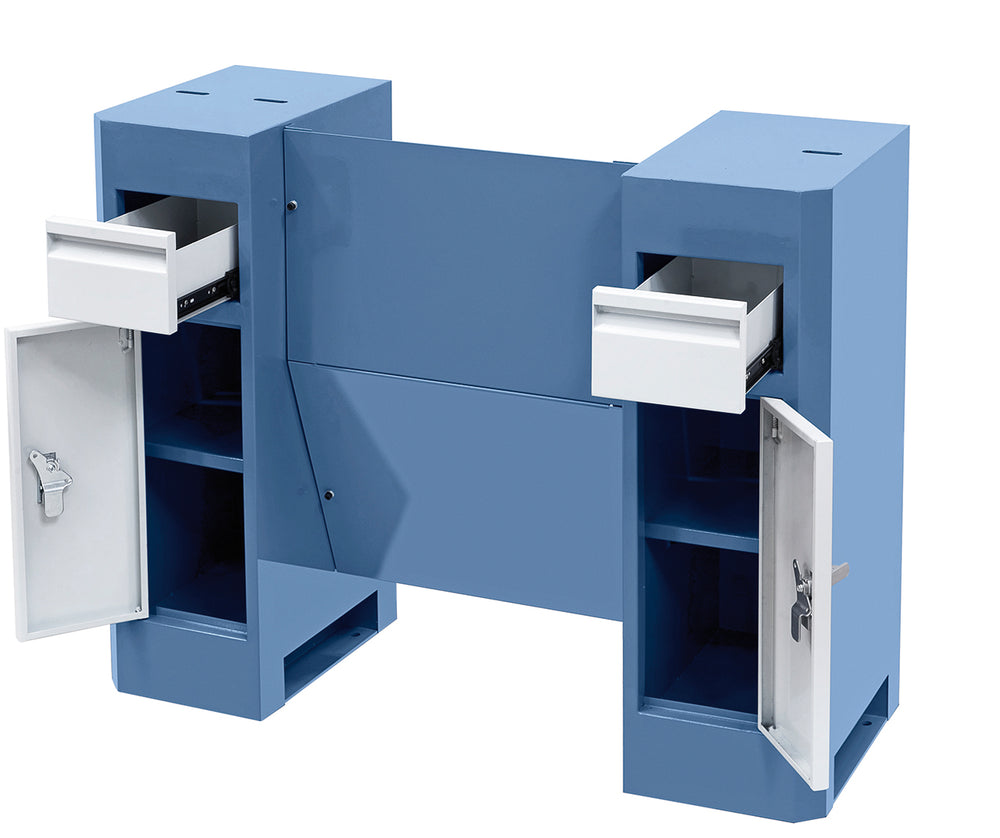La struttura verniciata RAL 5014 blu colomba integra ripiani e cassetti porta utensili, ideali per organizzare accessori, chiavi e componenti.