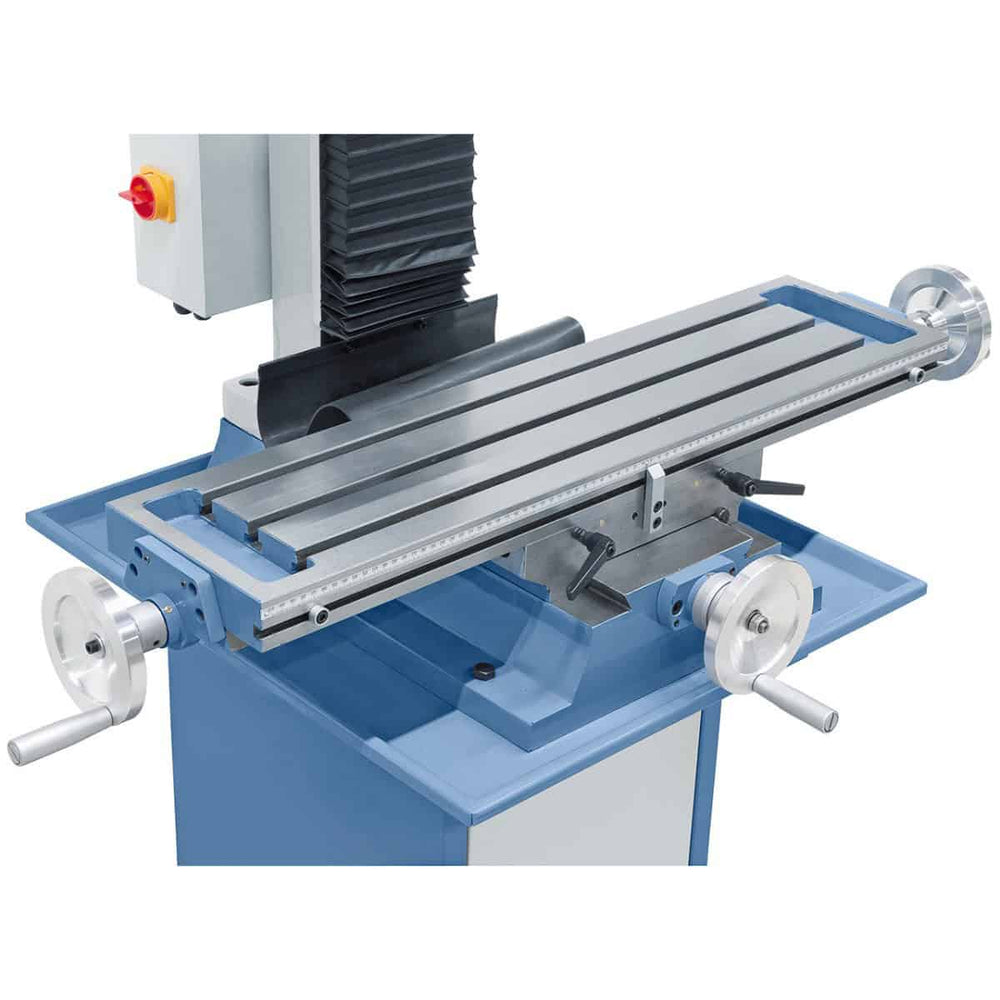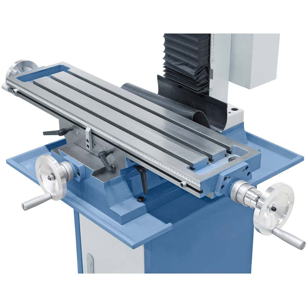 La testa inclinabile -90°/+90°, la tavola a croce di grandi dimensioni (840 x 210 mm) e le corse di 535 x 225 mm consentono un’ampia gamma di applicazioni: fresatura di cave, spianatura, alesatura e filettatura fino a M20. Le guide a coda di rondine sugli assi X, Y e Z e i cuscinetti di precisione (concentricità ≤0,015 mm) assicurano stabilità e accuratezza.