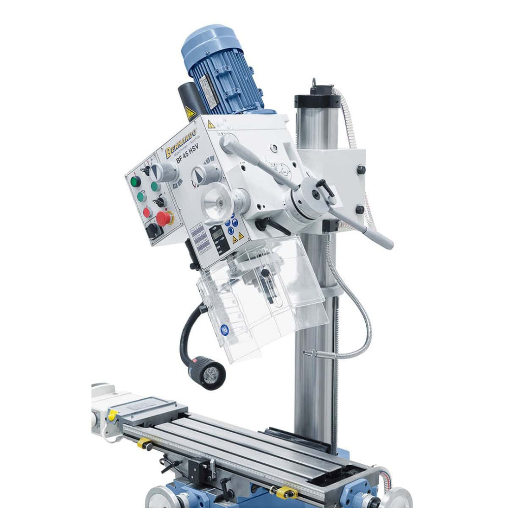 Il trapano-fresatrice Bernardo BF 45 HSV è una macchina robusta e professionale, pensata per foratura, fresatura e filettatura. Grazie al motore a 2 velocità con 12 gamme di rotazione (75–3200 rpm), agli ingranaggi temprati e rettificati in bagno d’olio e alla colonna in acciaio lucidato, garantisce prestazioni costanti anche sotto carichi intensivi.