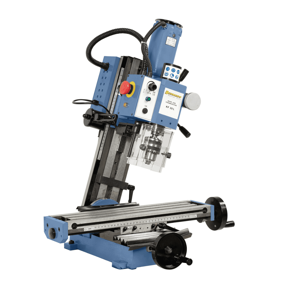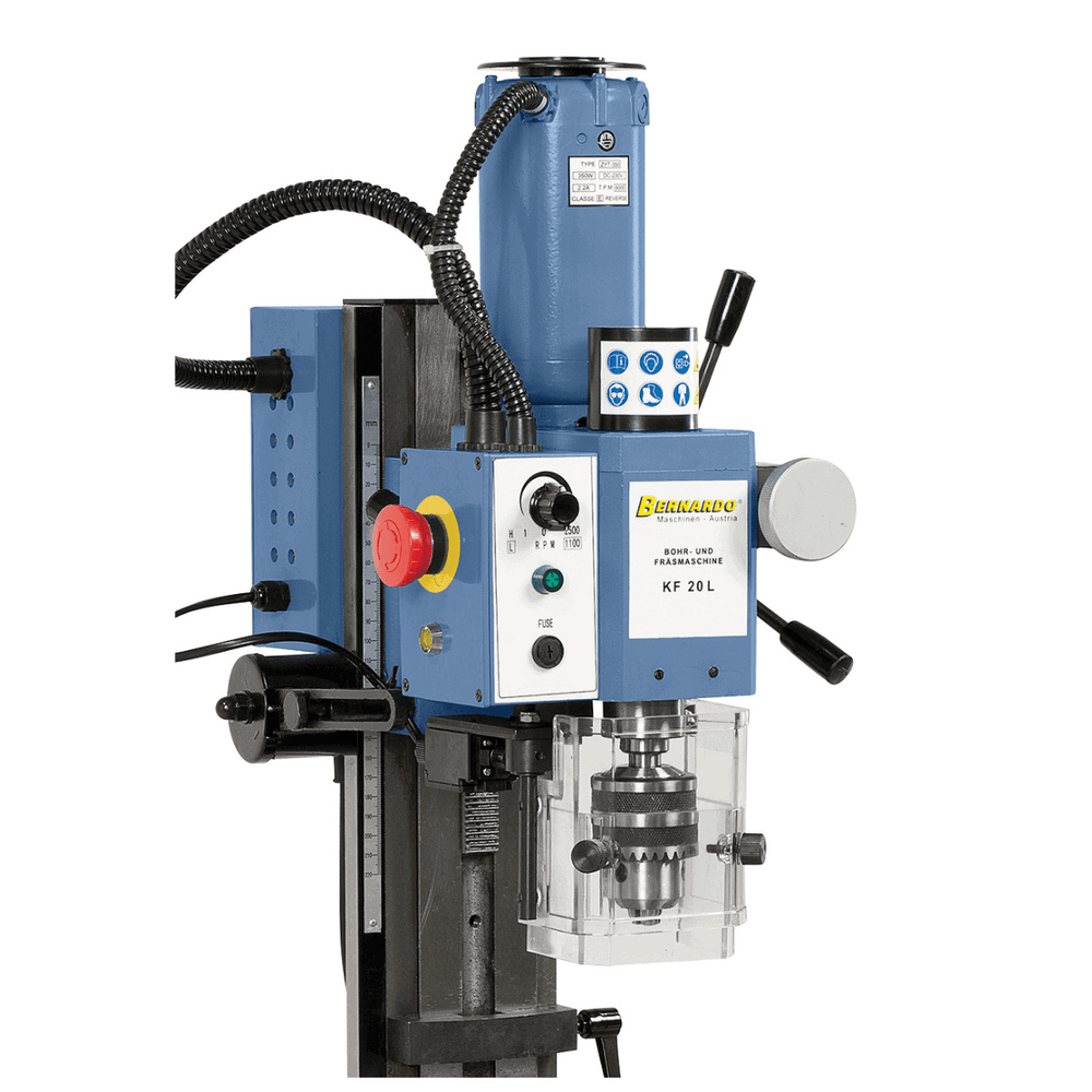 La trapano-fresatrice Bernardo KF 20 L è una macchina da banco precisa e affidabile, ideale per piccoli laboratori, officine e hobbisti evoluti. Grazie alla testa inclinabile da -45° a +45° amplia notevolmente il campo di utilizzo, permettendo lavorazioni angolari e smussi.