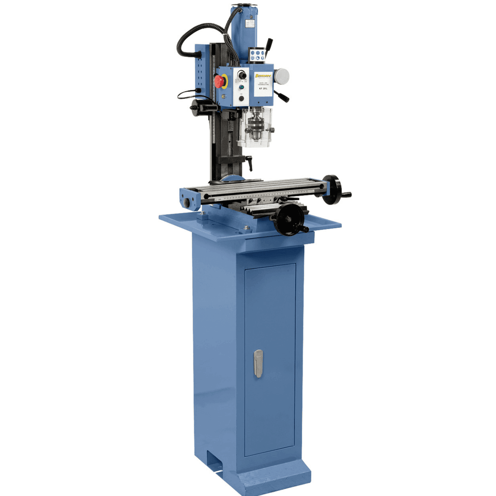 Le guide a coda di rondine sugli assi X, Y e Z sono regolabili e possono essere bloccate singolarmente per garantire stabilità durante la fresatura. Il sistema di trasmissione elettronico a variazione continua offre un’ampia gamma di velocità (0–1000 rpm in bassa, 0–2500 rpm in alta), adattandosi a diversi materiali. Il mandrino con avanzamento fine e le manopole ergonomiche assicurano controllo e precisione in ogni lavorazione. Con un piano crociato da 460 x 120 mm dotato di cave a T, la KF 20 L è una scelta compatta e solida per chi cerca prestazioni elevate in poco spazio.