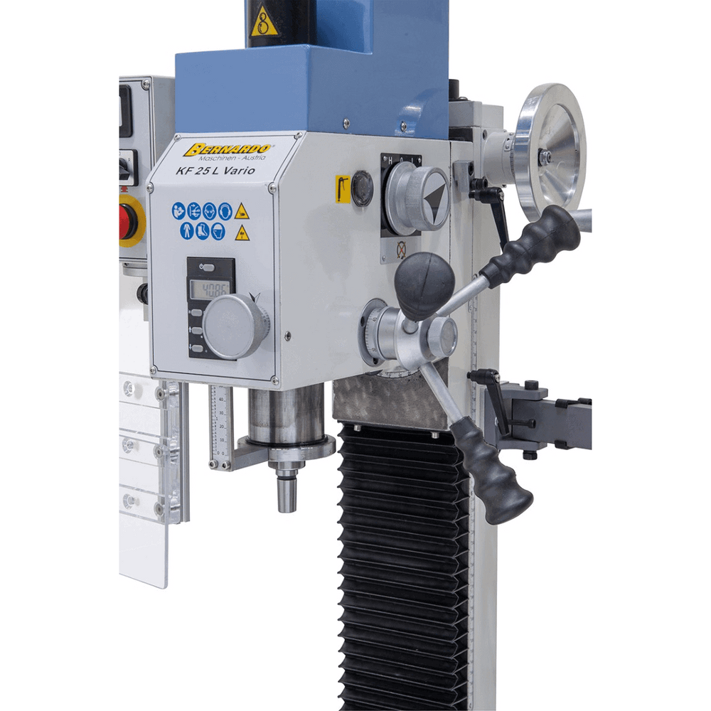 La trapano-fresatrice Bernardo KF 25 L Vario è una macchina versatile e precisa, adatta sia a officine che a laboratori di meccanica leggera. Grazie al cambio a due stadi e alla regolazione continua della velocità (50–1125 / 100–2250 giri/min), permette un adattamento ideale a ogni materiale e lavorazione.
