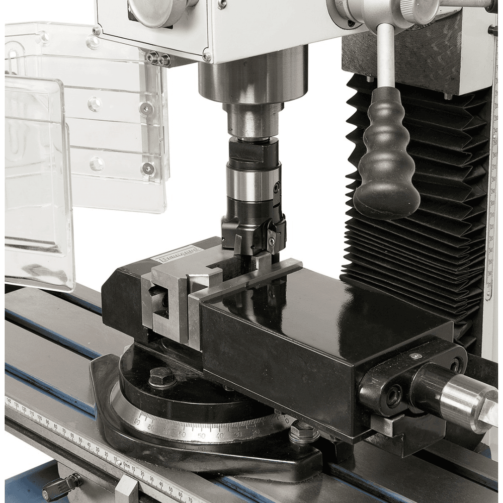 Tra le funzioni principali rientrano la filettatura, la fresatura di cave, la spianatura e le forature angolari grazie alla testa inclinabile ±90°. È dotata di serie di visualizzatore digitale a 3 assi DT 40, indicatori digitali della velocità e della corsa del mandrino, oltre a filtro EMC per la protezione da interferenze elettromagnetiche. La tavola a croce di grandi dimensioni (700 x 180 mm) con righello longitudinale e cave a T assicura stabilità e precisione, mentre i cuscinetti conici garantiscono concentricità ≤0,015 mm.