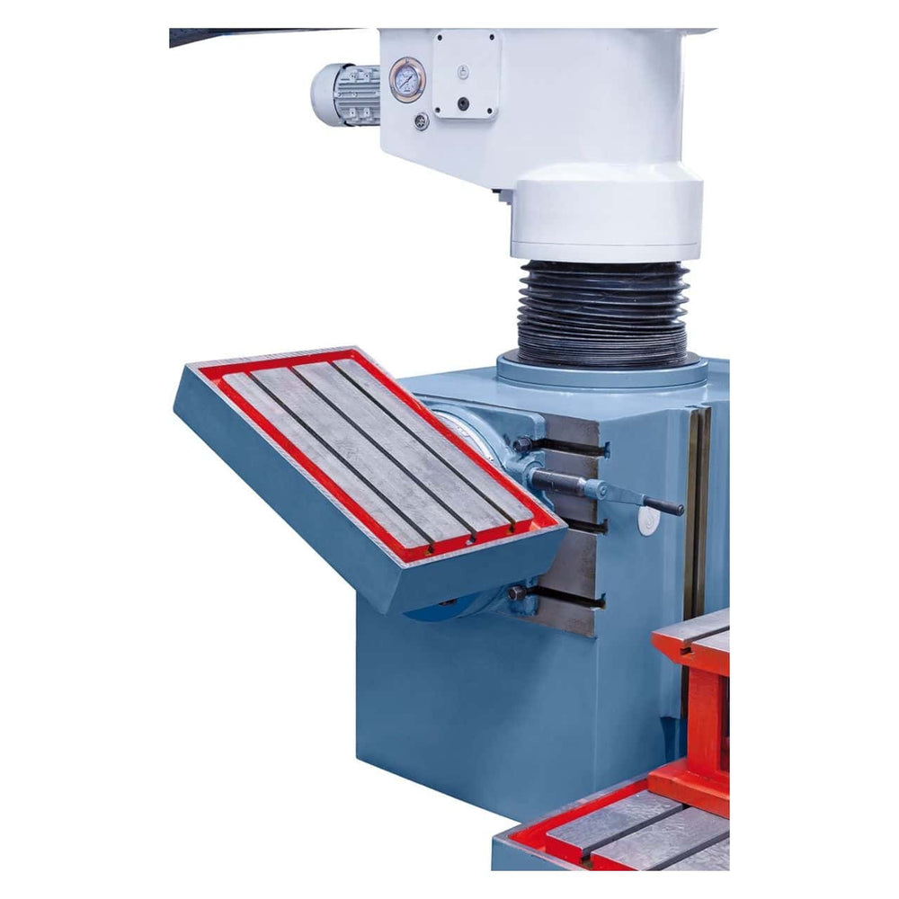 La costruzione robusta con colonna da Ø 220 mm e braccio radiale rigido assicura lavorazioni prive di vibrazioni. La testa è regolabile elettromotorizzata in altezza, inclinabile da -90° a +90° e dotata di serraggio idraulico, ideale anche per forature profonde.