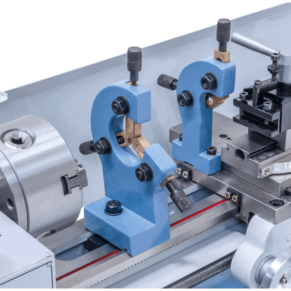 Il tornio da banco Bernardo Hobby 350 Vario / 230 V è progettato per hobbisti e piccoli laboratori che desiderano precisione e versatilità in poco spazio. Con una distanza tra le punte di 350 mm e un’altezza di centro di 90 mm, consente la lavorazione di pezzi fino a Ø 180 mm. Il foro mandrino da 20 mm (cono MT3) e la regolazione continua della velocità (50 – 1100 / 120 – 2500 rpm) permettono un’ampia gamma di applicazioni. Dotato di mandrino autocentrante da 100 mm, torretta portautensili a cambio rapido e paraspruzzi, unisce praticità e sicurezza. Il display digitale della velocità facilita il controllo delle lavorazioni. Con soli 52 kg e dimensioni compatte, si posiziona facilmente su banco da lavoro, risultando ideale per chi cerca un mini tornio robusto e preciso.