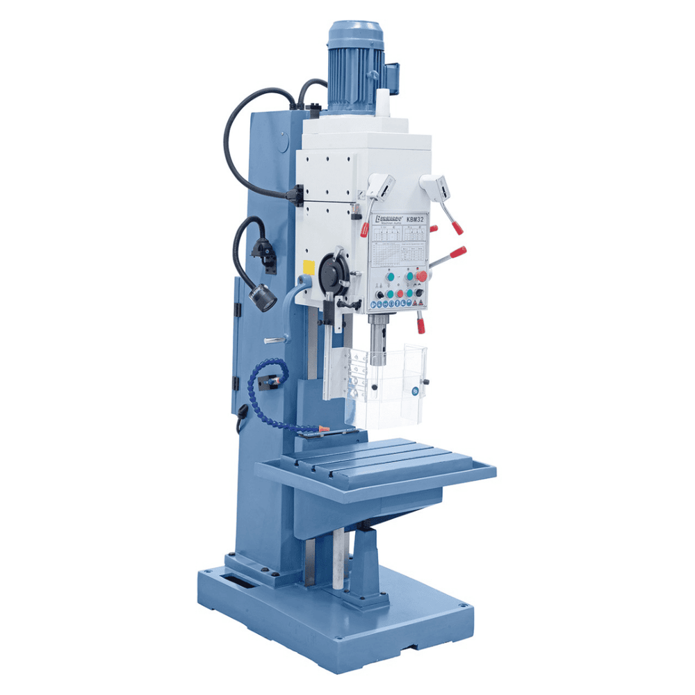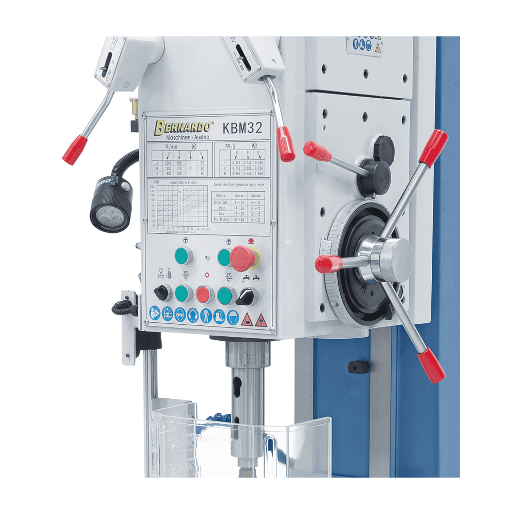 Il Bernardo Trapano a colonna fissa KBM 32 è una macchina robusta e compatta, progettata per lavorazioni professionali e industriali di media capacità. Con una capacità di foratura fino a 32 mm in acciaio e filettatura fino a M22, offre prestazioni affidabili e grande versatilità. La struttura in ghisa massiccia e le guide a coda di rondine regolabili garantiscono stabilità e precisione durante l’uso. Il motore da 2,2 kW eroga una coppia di 160 Nm con forza di avanzamento fino a 9.000 N. Il mandrino dispone di avanzamento automatico con 9 gamme di avanzamento e velocità variabili da 50 a 2000 giri/min (9 passi). Completo di dispositivo di filettatura con inversione automatica, lampada LED, refrigerante e protezioni, il KBM 32 rappresenta una soluzione efficiente e sicura per officine e reparti produttivi.
