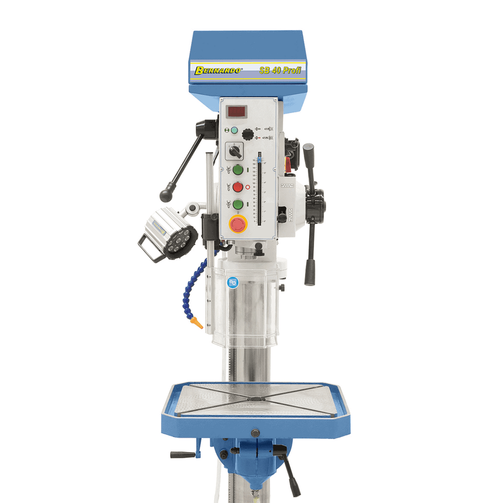 Il Bernardo Trapano a colonna SB 40 Profi è progettato per garantire precisione e robustezza nelle lavorazioni professionali in officina. Grazie al sistema Vario-drive, offre una regolazione continua della velocità (90 – 1455 rpm) leggibile sul display digitale integrato, permettendo un controllo ottimale in base al materiale lavorato. L’avanzamento del mandrino può essere manuale o automatico, con tre passi di avanzamento (0,1 / 0,2 / 0,3 mm/giro) per massima precisione. Il solido piano in ghisa inclinabile da -50° a +50°, dotato di cave a T e scanalature di raffreddamento, assicura stabilità e versatilità. Incluso di serie: pompa refrigerante, lampada LED e dispositivo di sgancio automatico utensile. Con una capacità di foratura fino a Ø 40 mm e un motore da 1,5 kW, il SB 40 Profi è la scelta ideale per officine, carpenterie e lavorazioni professionali.