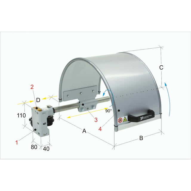 Il cappuccio protettivo, dotato di scudo protettivo semicircolare, può essere montato sulla testa del mandrino sia lateralmente che posteriormente