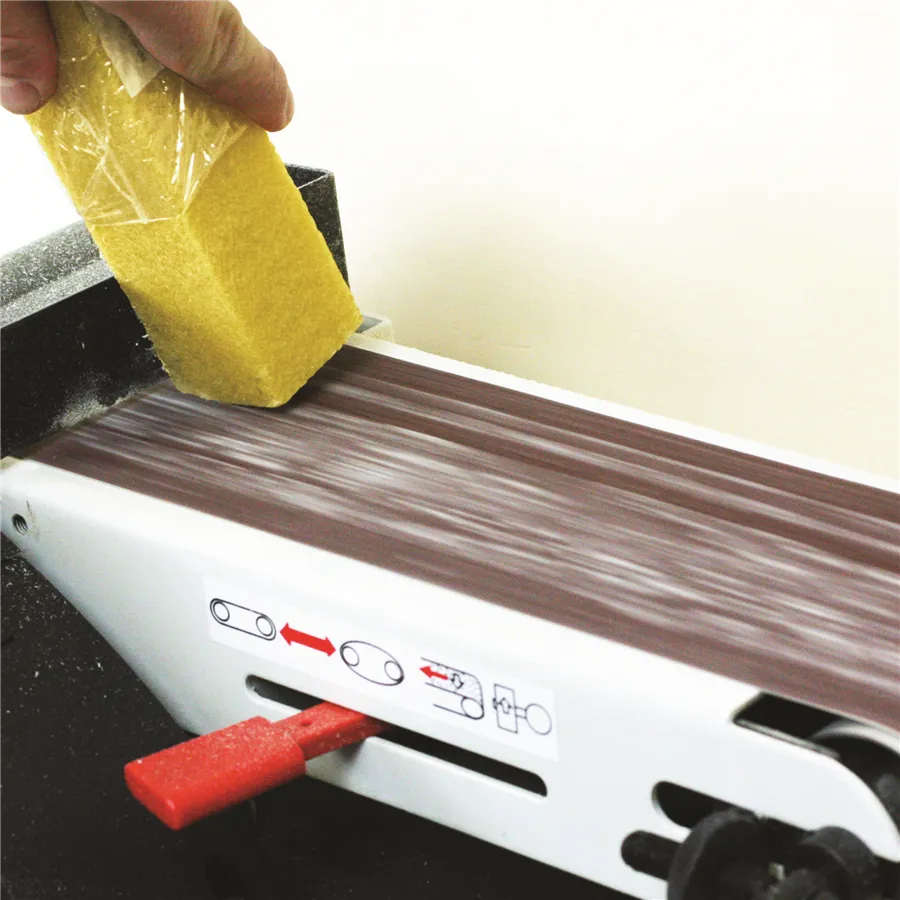 Accendere la levigatrice e avvicinare lo stick al nastro o disco in movimento, premendo saldamente. Il materiale gommoso raccoglie le particelle fini incastrate nella superficie abrasiva, ripristinando l’efficacia del nastro o del disco.