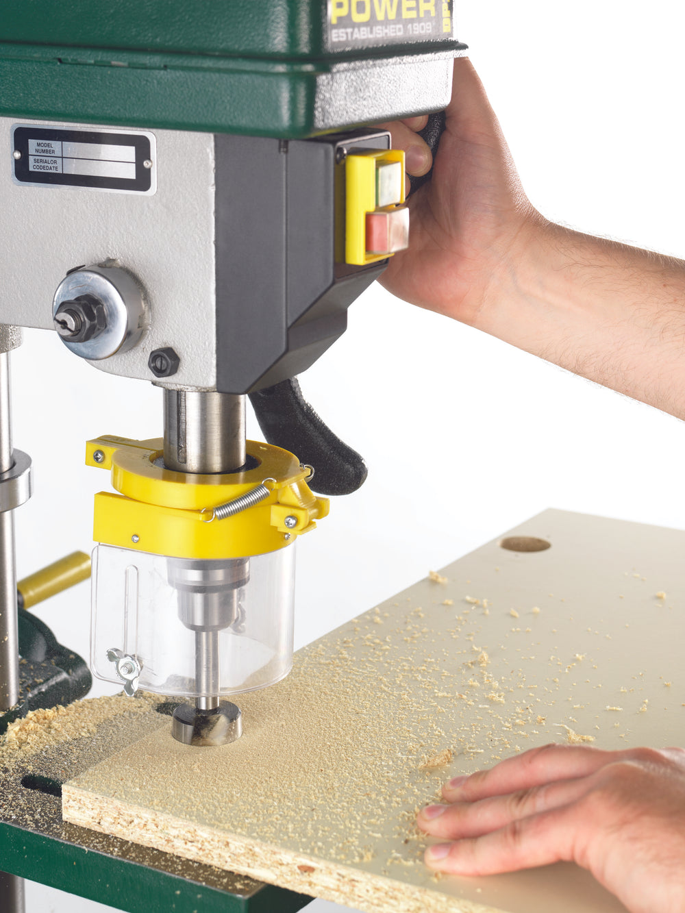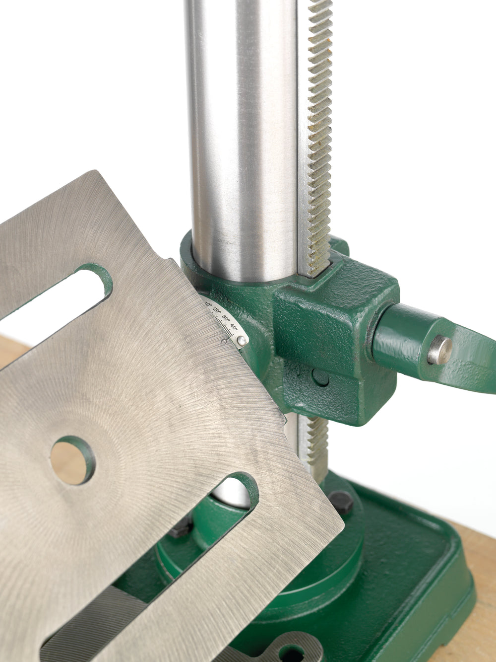 Il tavolo in ghisa inclinabile fino a 45° consente forature angolate e può essere abbassato o ruotato lateralmente per utilizzare la base come piano di lavoro aggiuntivo. La struttura in ghisa e acciaio, il motore dedicato e il peso di 27 kg garantiscono stabilità, riduzione delle vibrazioni e maggiore sicurezza in uso continuativo.