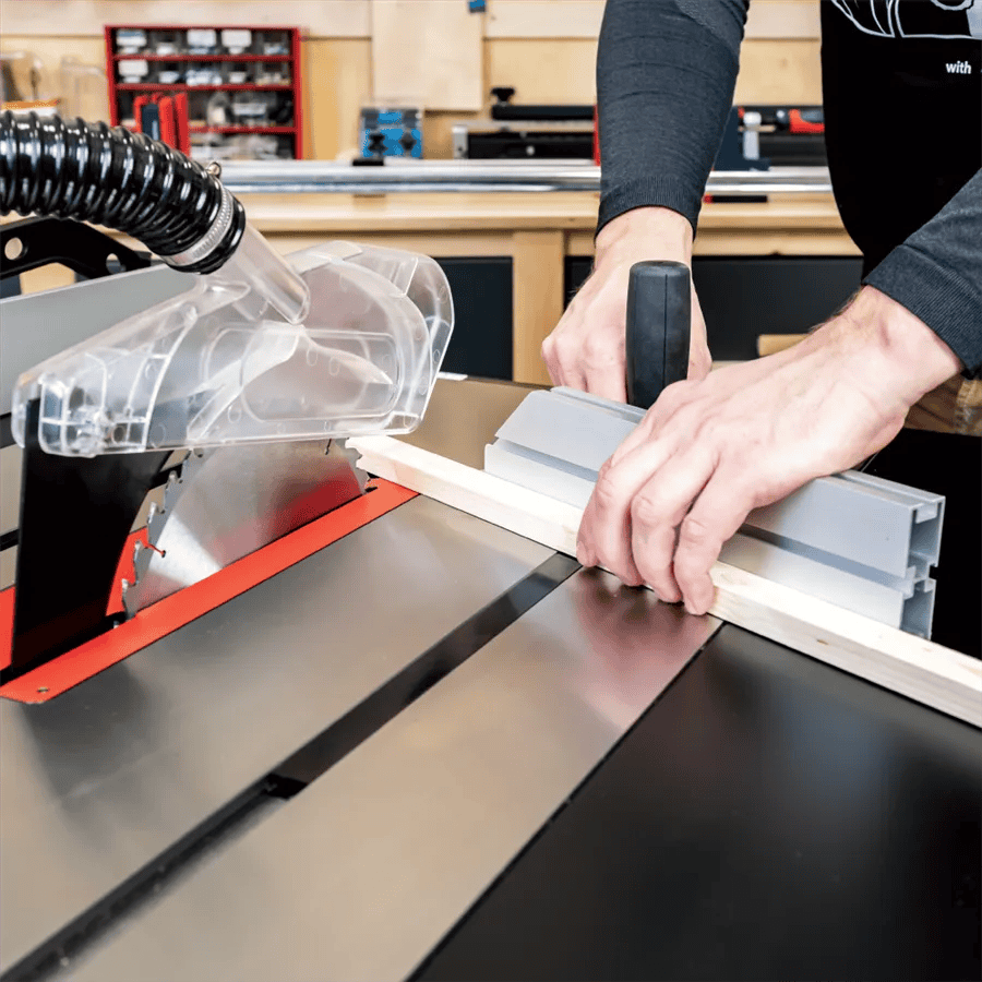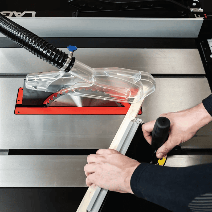 Il sistema raccoglie la polvere sia dalla parte inferiore del cabinet che dalla protezione superiore della lama, mantenendo pulita l’area di lavoro.