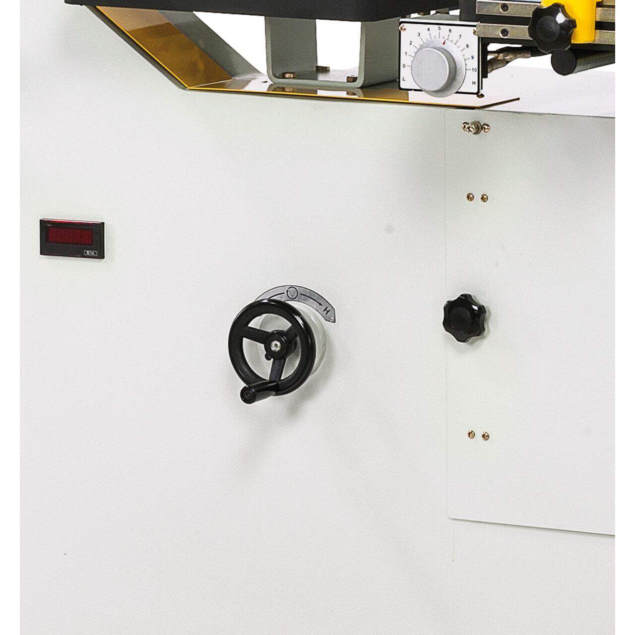 La Bernardo VMS 1000 A è una sega a nastro verticale di grande capacità, progettata per tagli complessi, sagomati e di precisione su metallo. È dotata di tavolo in ghisa massiccia con ampio piano di lavoro (660 x 700 mm + tavolo aggiuntivo 450 x 490 mm), inclinabile di 5° a sinistra e 15° a destra, e avanzamento automatico con corsa di 350 mm. La velocità della lama è regolabile in continuo su due gamme (20–85 m/min e 120–500 m/min), tramite display LED digitale, per adattarsi a diversi materiali. Accessori standard come saldatrice lama con ricottura, cesoia, mola integrata e pistola ad aria compressa consentono di rigenerare le lame direttamente in officina. Con capacità di taglio fino a 1010 mm in larghezza e 340 mm in altezza, lama da 4540 mm, motore da 1,5 kW e peso di 950 kg, è una macchina robusta e affidabile, perfetta per officine e carpenterie che richiedono efficienza e versatilità.