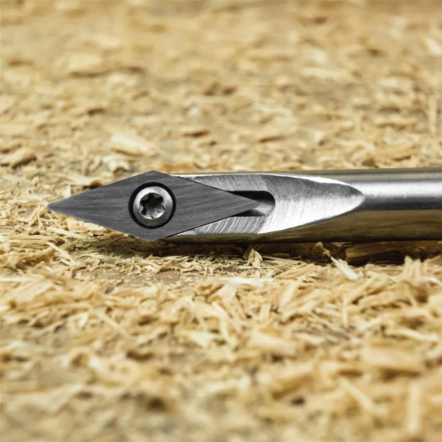 Il Set di Scalpelli con Punta Sostituibile include 3 scalpelli dotati di tre tipologie di punte: quadrata, tonda e a diamante. La punta quadrata è utilizzata per la sgrossatura del materiale e la realizzazione di tenoni. La punta tonda è adatta anch'essa per la sgrossatura o la modellazione di curve. Con la punta a diamante è possibile realizzare scanalature e altri dettagli. La punta in carburo di lunga durata non necessita di affilatura. Quando si consuma, è sufficiente ruotarla. La punta deve essere sostituita non appena il bordo risulta consumato su tutti i lati.