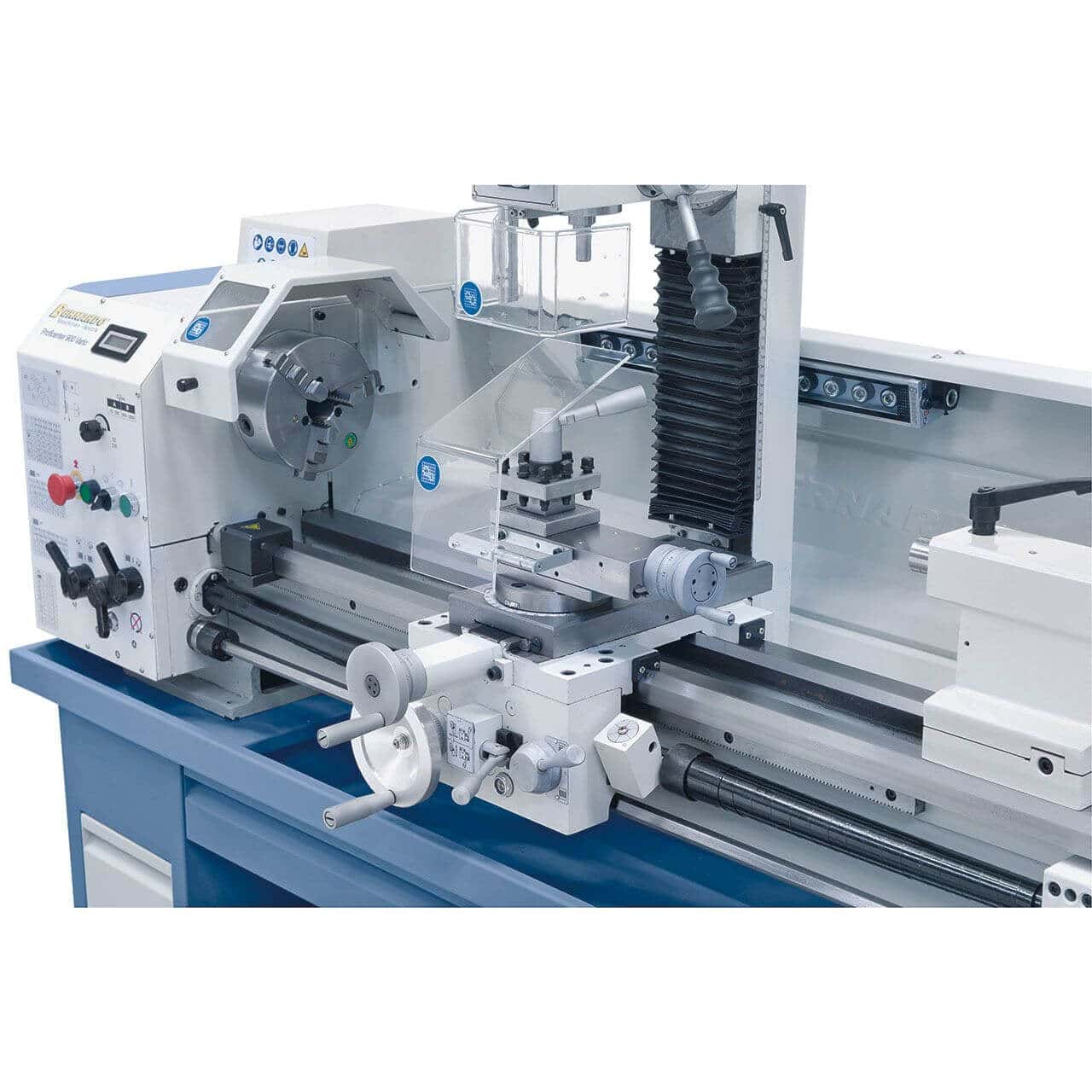 Il centro di lavoro Bernardo Proficenter 900 Vario / 400 V unisce in un’unica macchina le funzioni di tornio e fresatrice, garantendo versatilità e precisione per officine, scuole tecniche e hobbisti evoluti. Con passaggio barra da 38 mm e bancale prismato temprato a induzione, il tornio offre rigidità e lunga durata. L’inverter integrato consente regolazione continua della velocità (75–2000 giri/min), leggibile sul display digitale. La fresatrice verticale integrata dispone di testa inclinabile ±90°, velocità continua fino a 2250 rpm e capacità di foratura fino a 20 mm, ideale per lavorazioni angolari e complesse. Con mandrino autocentrante, torretta portautensili, mandrino portapunte e numerosi accessori inclusi, il Proficenter 900 è la soluzione professionale e compatta per chi cerca un centro di lavoro completo.
