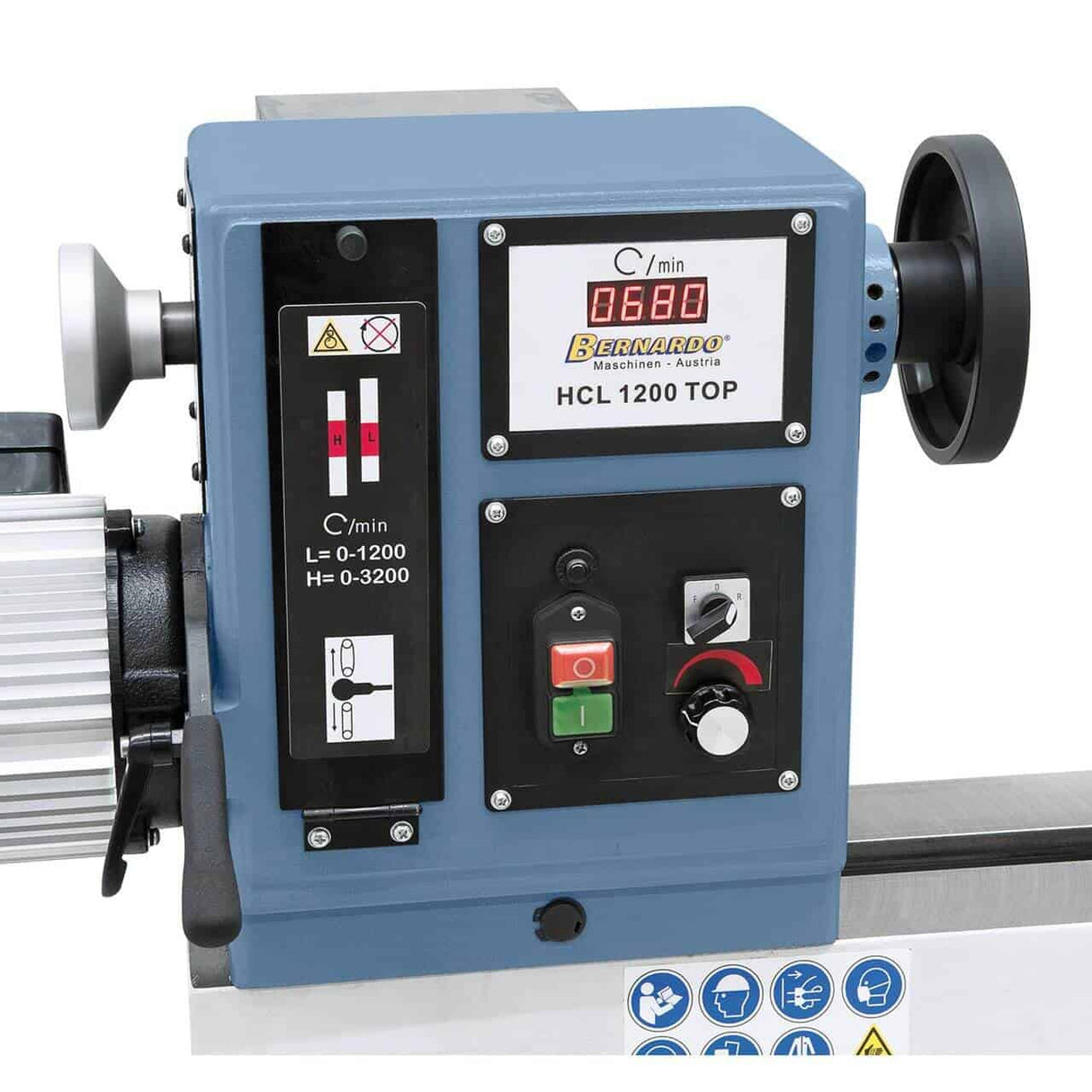 Il tornio è dotato di inverter Delta che permette una regolazione continua della velocità su due gamme: 0–1200 rpm e 0–3200 rpm.