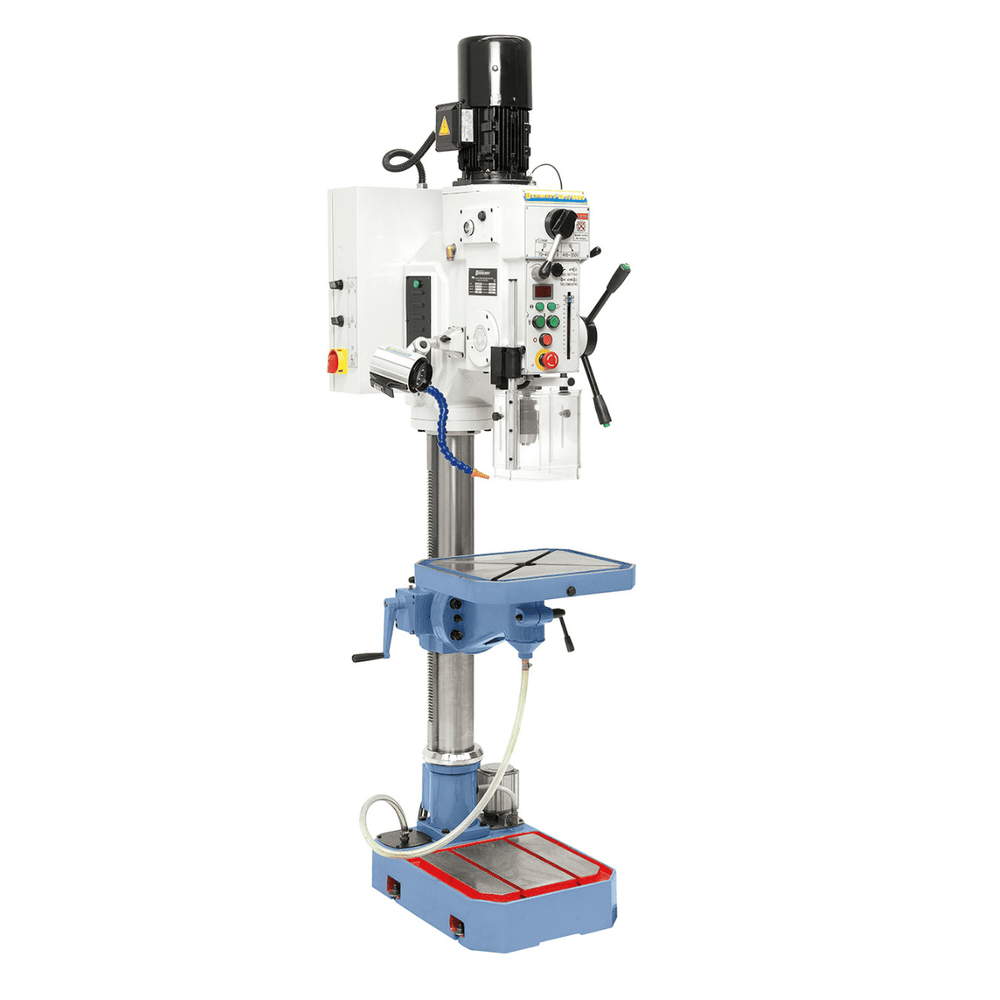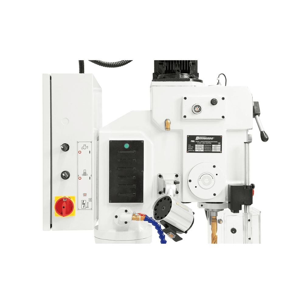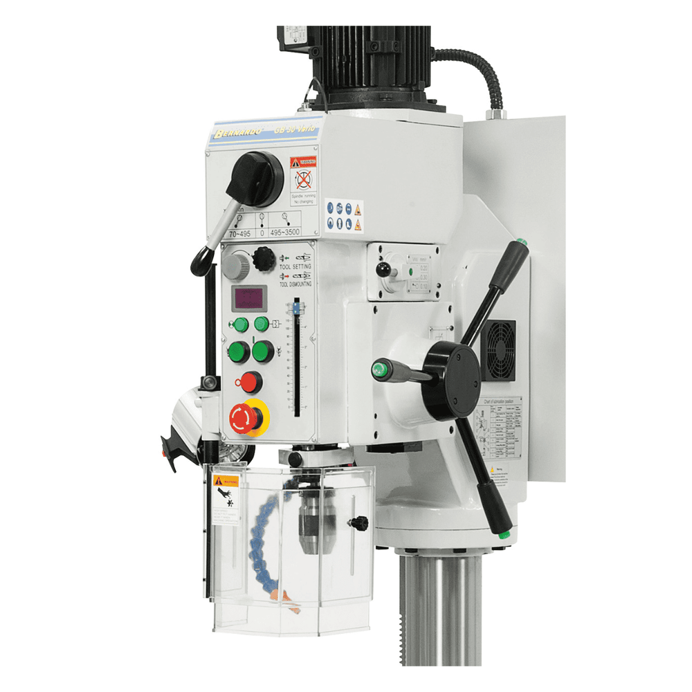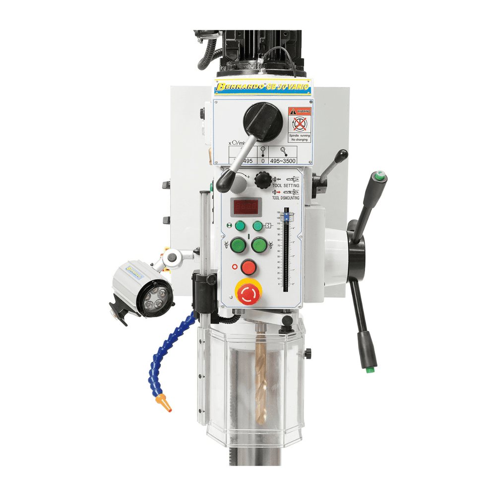 Il Bernardo GB 30 Vario è un trapano a colonna ad ingranaggi con regolazione continua dei giri e indicatore digitale della velocità, progettato per officine, manutenzione e produzione. Grazie all’avanzamento elettromagnetico del mandrino, al dispositivo di filettatura e all’impianto di refrigerazione integrato, offre precisione, ripetibilità e lunga durata anche in lavorazioni gravose. La capacità di foratura arriva fino a Ø 32 mm nell’acciaio e Ø 35 mm nella ghisa, con filettatura max. M22. Il cono Morse MK3 e gli accessori in dotazione (mandrino 1–13 mm/B16, bussole di riduzione, espulsore automatico, luce LED, coperchio di protezione) rendono l’allestimento completo e subito operativo, grazie anche al riempimento iniziale con Shell Tellus 46. Struttura solida, colonna Ø 110 mm e peso 320 kg per lavorazioni stabili e sicure.