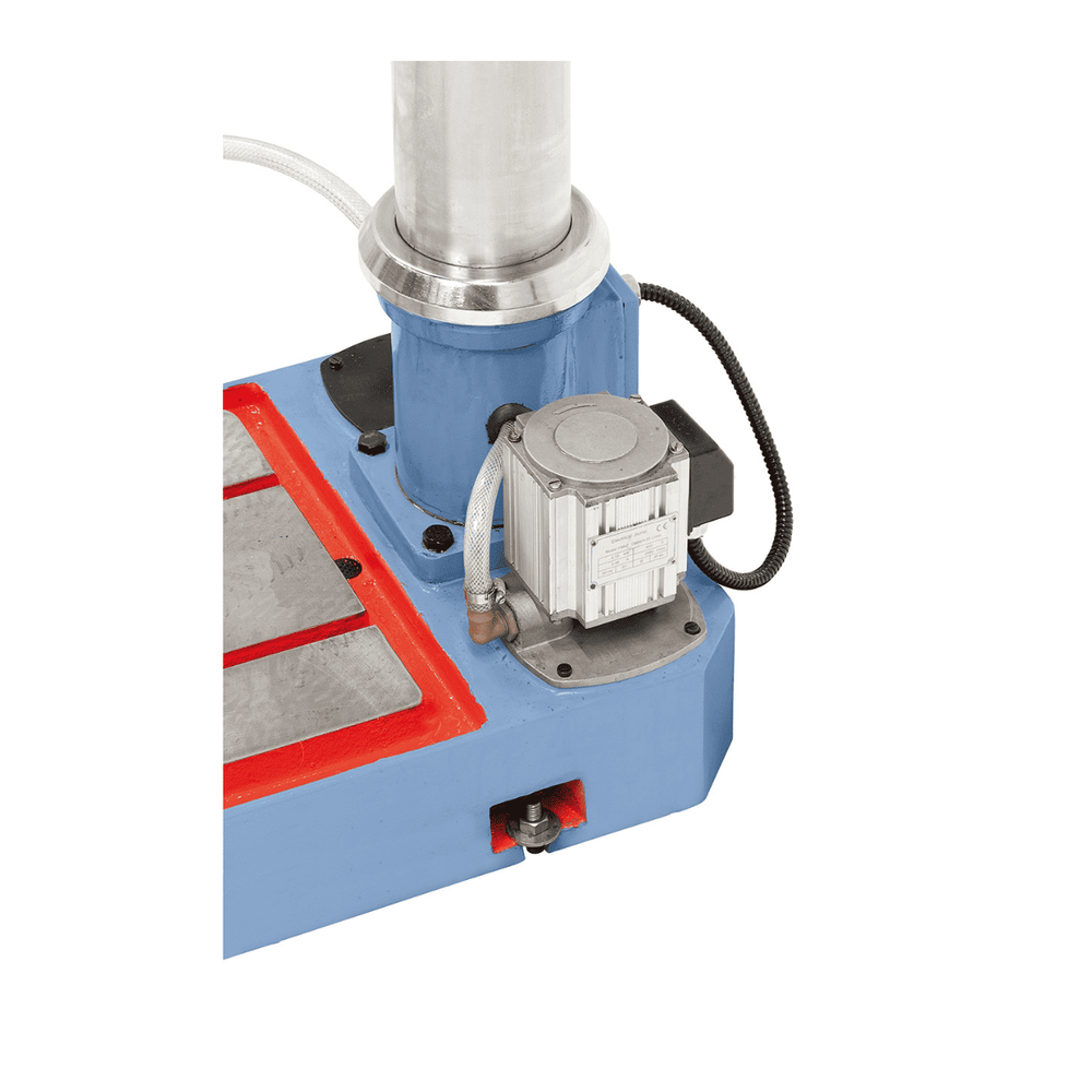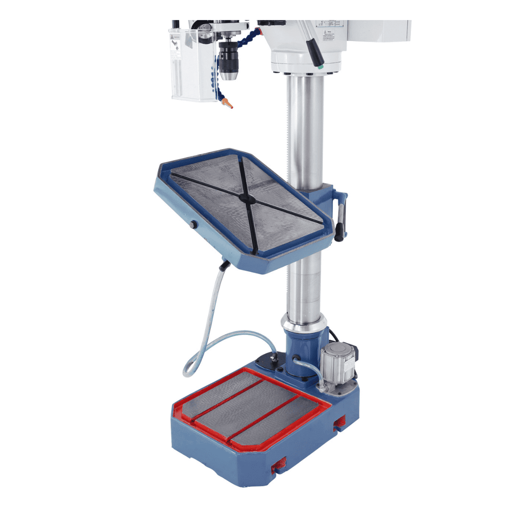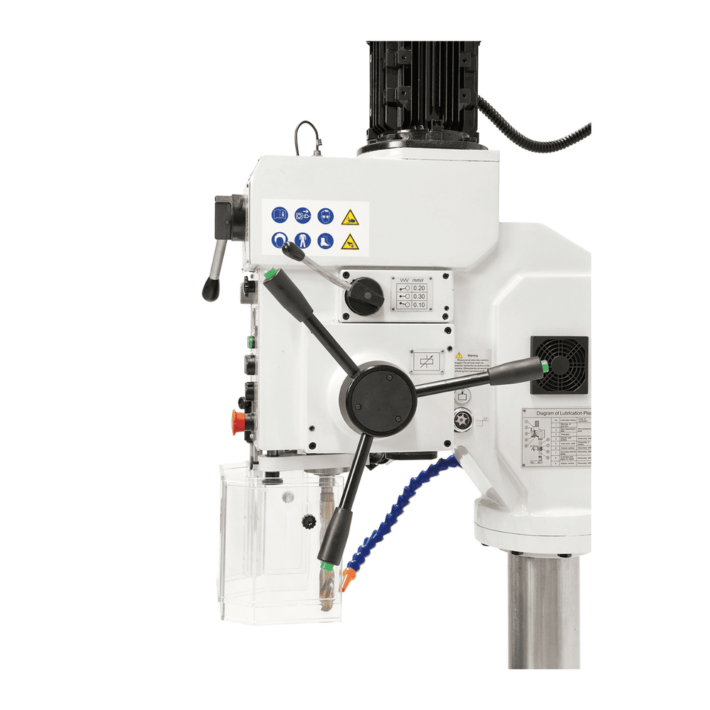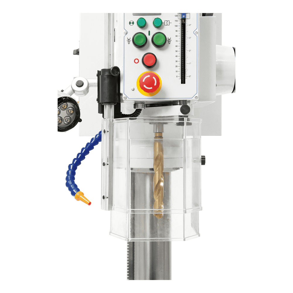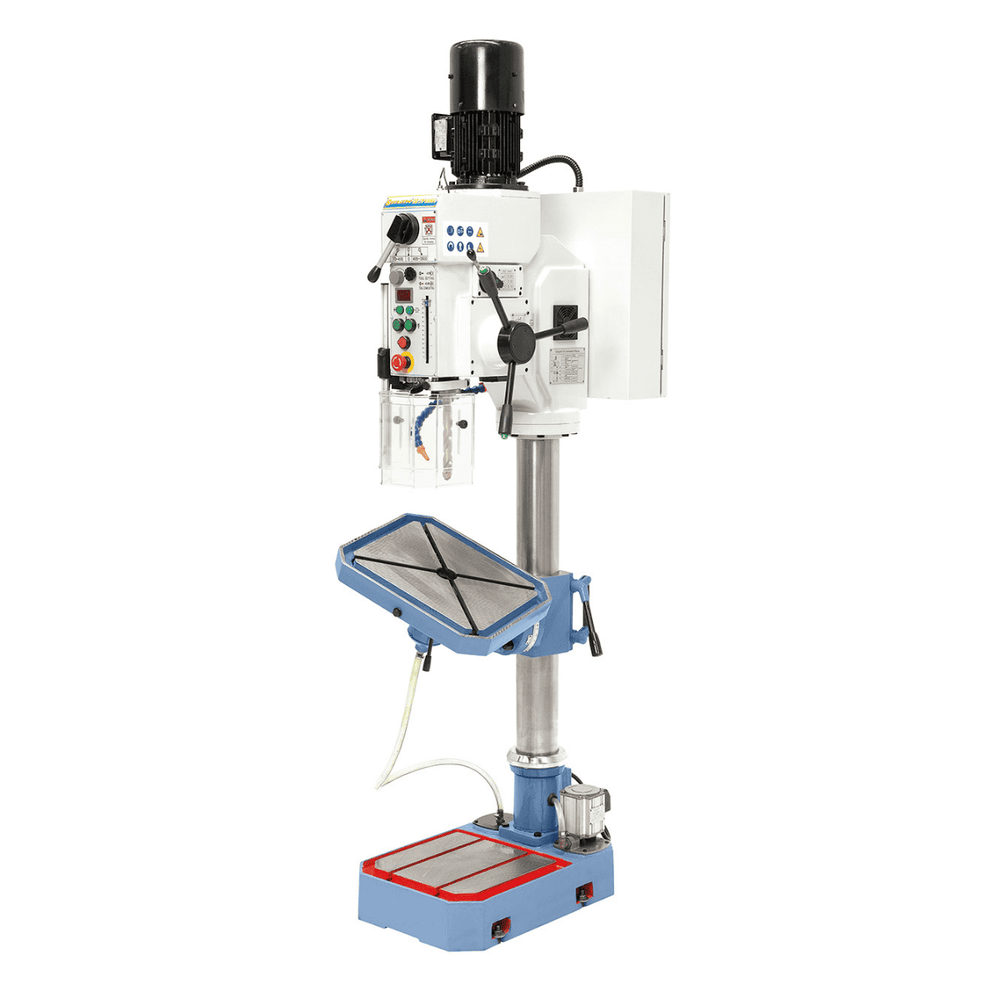 Il Bernardo GB 30 Vario è un trapano a colonna ad ingranaggi con regolazione continua dei giri e indicatore digitale della velocità, progettato per officine, manutenzione e produzione. Grazie all’avanzamento elettromagnetico del mandrino, al dispositivo di filettatura e all’impianto di refrigerazione integrato, offre precisione, ripetibilità e lunga durata anche in lavorazioni gravose. La capacità di foratura arriva fino a Ø 32 mm nell’acciaio e Ø 35 mm nella ghisa, con filettatura max. M22. Il cono Morse MK3 e gli accessori in dotazione (mandrino 1–13 mm/B16, bussole di riduzione, espulsore automatico, luce LED, coperchio di protezione) rendono l’allestimento completo e subito operativo, grazie anche al riempimento iniziale con Shell Tellus 46. Struttura solida, colonna Ø 110 mm e peso 320 kg per lavorazioni stabili e sicure.